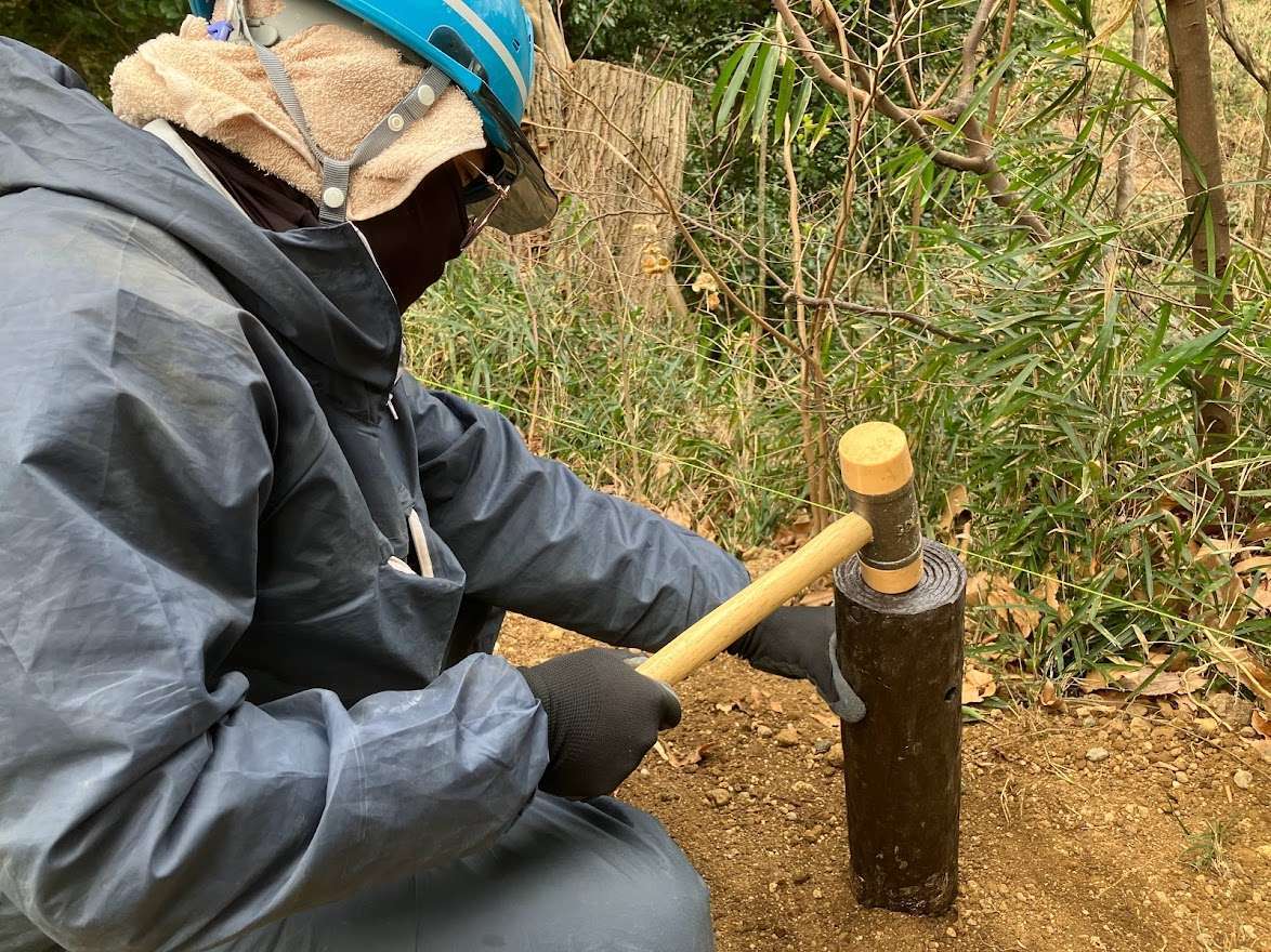 プラ擬木の杭は短いので比較的掘削が浅いのですが、プラ擬木の柵は鋼管を打ち込むので木の根っこやガラなどにあたってしまい苦戦してしまいました、、