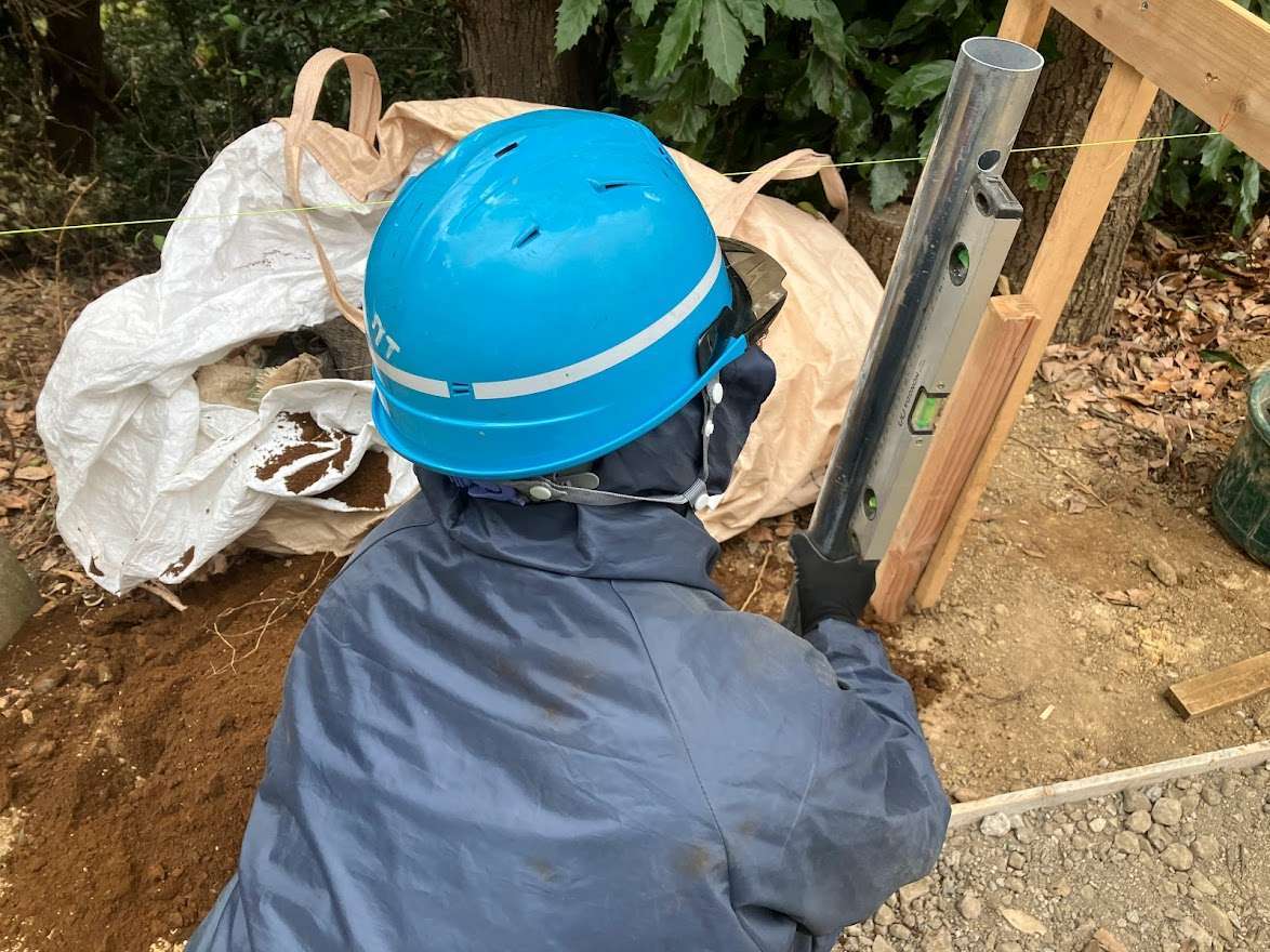 水平器とスケールを使って擬木の杭や柵の設置工をするのですが、非常に難しかったです!