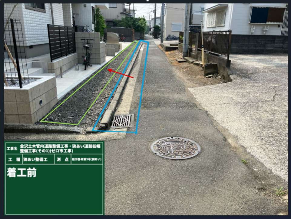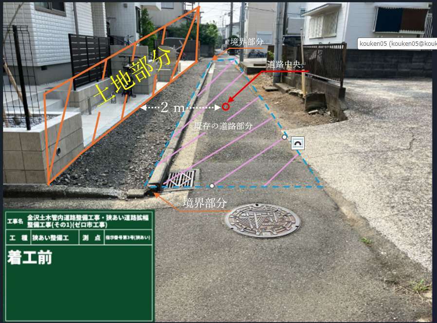 写真左側が土地部分になります。写真中央が道路部分になります。既存の道路部分を赤く書かれている道路中央部分から2m道路幅を広げてくださいという工事となりました。わかりずらくて申し訳ありません(;_;)