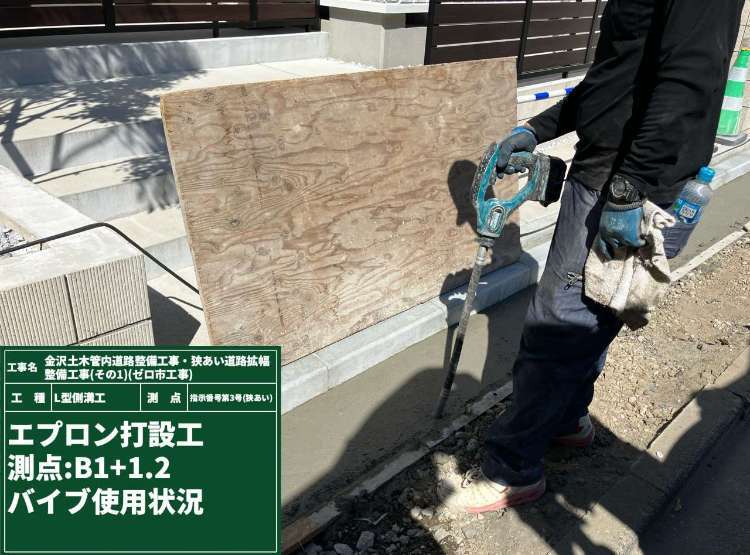 地先境界ブロックの下段部分に型枠を組み生コンを流し込みエプロン部分を作成します。写真は生コン打設中のバイブを使用している状況写真になります。振動を与えることにより生コン内の空気や水分を効率よく抜くことができます。